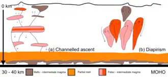 45. ^ Weinberg, R. F.; Podladchikov, Y. (1994). "Diapiric ascent of magmas through power law crust and mantle". Journal of Geophysical Research. 99 (B5): 9543. Bibcode:1994JGR....99.9543W. doi:10.1029/93JB03461. S2CID 19470906.
