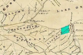 1. ^ Cf. detailed 1876 map of Grantham Township, Illustrated Historical Atlas of the counties of Lincoln and Welland, Ont. (Toronto : H.R. Page & Co., 1876).