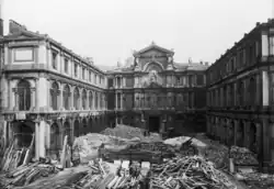 In 1928, the Free University had to make way for the North–South connection after 75 years. Although located some distance from the actual railway tunnel, the Granvelle Palace was demolished in 1931.[26] The municipality of Woluwe-Saint-Pierre acquired its façades with the aim of reusing them in the construction of its new Municipal Hall, which ultimately did not happen. Unsculpted blue stones were used as sidewalk curbs in 1944, part of the white stones was used for the construction of a colonnade in Woluwe-Saint-Pierre Cemetery, and the rest was gradually sold to various private individuals.[27] In 1956, the Ravenstein Gallery was built on the site.[26][28]