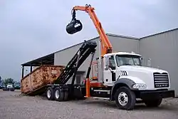 A grapple truck is a truck that has a grapple loader mounted to its frame which is used for loading and sometimes hauling bulky waste. Grapple trucks are commonly used by municipal sanitation or public works departments, and by waste collection companies. Grapple trucks can also sometimes be used in road construction and repair. There are six types of bulky waste collection system in which grapple trucks are used: loader and body systems, rear steer system, rolloff systems, rear mounted loader and haul truck systems, rear mounted loader and trailer systems, and transfer systems.