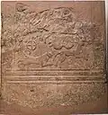 There were a number of grave stelai or stelae found among the six shaft graves at Grave Circle A in the site of Mycenae. These stelai mark the burial sites of the Mycenaean dead, much like modern headstones. At least 21 stelai have been discovered from Grave Circle A, with 12 having identifiable relief sculpture. Most were upright, rectangular slabs of oolithic limestone, ranging in date from 1600 to 1500 BCE.[1] The iconography depicted on these stelai include chariot scenes, hunting scenes, and circular and spiral designs characteristic of the Greek Mycenaean Period.[2] Scholars argue that these scenes demonstrate the prevalence of warfare in Mycenaean culture,[2] in addition to signifying a socially stratified society.[3]