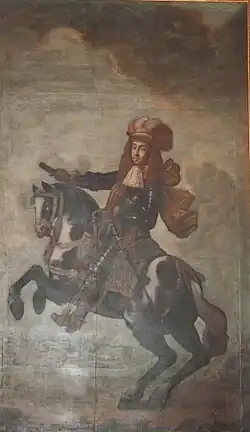 Over the centuries many works of art were collected in the mansion. The ceremonial hall was painted in the mid-nineteenth century by Giuseppe Lorenzo Gatteri, a fresco painter from Trieste.[1] The fresco on the ceiling depicts Apollo on a chariot.[7] Before World War II there was an important collection of work by the Venetian masters. The hall is reached by a richly stuccoed staircase from the left of the atrium. Three statues on the balustrade of the stairway represented sculpture, painting and architecture. One of these has been lost. Until 1967 there were four large equestrian portraits on the walls of this stairway: the Polish King John III Sobieski, Charles V, Duke of Lorraine the Austrian Emperor Leopold I and Prince Eugene of Savoy. The staircase today is hung with pictures of prominent members of the Gravisi family.[1]