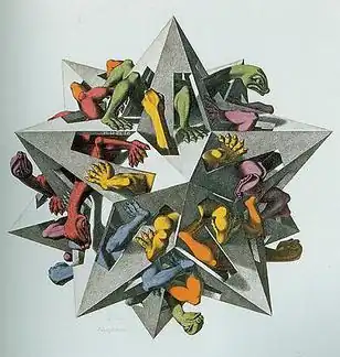 Gravitation (also known as Gravity) is a mixed media work by the Dutch artist M. C. Escher completed in June 1952. It was first printed as a black-and-white lithograph and then coloured by hand in watercolour.