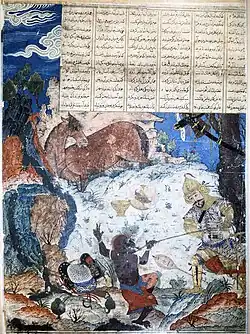The Great Jalayirid Shahnameh is a supposed lost illustrated manuscript of Ferdowsi's Shahnameh, the national epic of Greater Iran. It is thought to have been produced during the mid-14th century, during the reign of either Hasan Buzurg (1336–1356) or Uways (1356–1374).[1] The manuscript does not exist in its entirety, and its paintings have survived only through their inclusion in albums of sketches and individual paintings currently held in the Topkapı Palace in Istanbul.[1] Through comparison to other Shahnameh manuscripts, including the Great Mongol Shahnameh, Bernard O'Kane has argued for the existence of a unified Jalayirid Shahnameh manuscript, from which several paintings in the Topkapi albums were taken.[1]