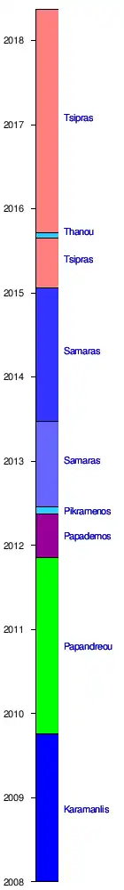 - 26 January 2015 – Syriza and the Independent Greeks join to form a new coalition government. Alexis Tsipras is sworn in as the new Prime Minister.[91] Yanis Varoufakis becomes the new finance minister.[92]