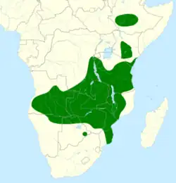 It is found in Angola, Botswana, Democratic Republic of the Congo, Kenya, Malawi, Mozambique, Namibia, Tanzania, Zambia, and Zimbabwe.
