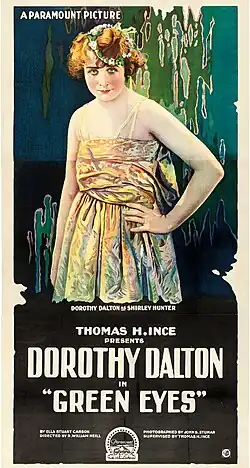 Green Eyes is a 1918 American silent drama film directed by Roy William Neill and written by Ella Stuart Carson, John Lynch, and R. Cecil Smith. The film stars Dorothy Dalton, Jack Holt, Emory Johnson, Doris May, Robert McKim, and Clyde Benson. The film was released on August 11, 1918, by Paramount Pictures.[1][2] It is not known whether the film currently survives.[3]