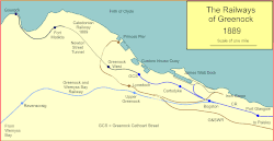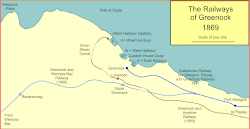 The G&SWR offered the possibility of a new direct rail connection to a new harbour and pier to the north-west of the town, which the Burgh was then constructing. This was a prodigious scheme for both parties, involving lengthy tunnelling for the railway. The excavation and construction of the Albert Harbour facilities cost £250,000. Prince's Pier cost around further £100,000.[2] The railway part of the scheme was to involve the upgrading of the Bridge of Weir line, the construction of a short line from Cart Junction (on that line) to Elderslie, and a new line from Bridge of Weir to Greenock.