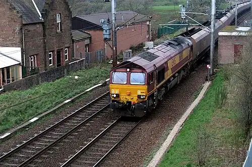 ![]() 66139 passes the former station building at Gretna in 2005. | |||||