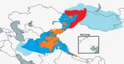 The species has been recorded as a vagrant as far east as Beijing in China.[18] Escaped or released captive birds have been reported in North America, but much more rarely than European goldfinch, with fewer than 1% of the number of that species.[19][20]