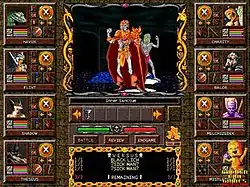 Grimoire is a dungeon-crawling role-playing video game played from a first-person perspective. The game features turn-based tactical combat with gameplay patterned closely after Wizardry 6 and Wizardry 7.[2] In the game, the player controls up to 8 party members. Intense difficulty is also a key feature of gameplay,[3] along with the aforementioned "old-school" nature; the game includes 2D graphics and MIDI music by composer Ellsworth Hall.[4] The game world is divided into tiles which the player can move between, with a camera view pointing in the four cardinal directions. Grimoire features an in-game map with an auto-walking option.