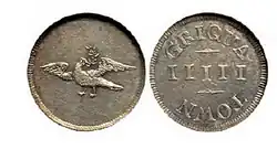 The silver Five "Pence" Obverse: A dove flying with an olive branch in its beak. Reverse: IIIII between two lines above and below with inscription GRIQUA (above) TOWN (below and upside down). Average diameter: 20.96 mm. Average thickness: 0.66 mm. Average mass: 2.37 gram. Edge: Reeded obliquely