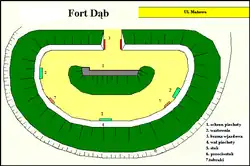 In 1892, an infantry bunker was built for 90 soldiers, made of brick and concrete. In 1898, a second infantry bunker was erected, this time made of concrete, which could accommodate 165 soldiers. Near the shelters, an earth battery was placed, capable of holding 6 guns of 90 mm caliber, as well as an earth battery for 6 guns of 120 mm caliber. The entire area was surrounded by a flattened rampart with a dense network of barbed wire. The fort was approximately 350 m long. For direct protection of the fort, two 2-chamber guardhouses for 34 soldiers and two guardhouses for 17 soldiers were placed in the rampart, as well as four concrete positions for 53 mm Fahrpanzers. Access to the fortifications was from the present Droga Graniczna Street.