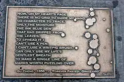 2. ^ "Chinese Poet, Wife Die in Murder-Suicide: AUCKLAND, New Zealand (AP) _ Chinese poet Gu Cheng, who left his homeland in 1987, killed his wife before hanging himself from a tree, police said today. His wife, Xie Ye, 35, had been beaten on the head with a tomahawk and was found lying on a path leading to a house. She was taken to a hospital, but died 90 minutes later". Ap News. 9 October 1993 – via apnews.com.