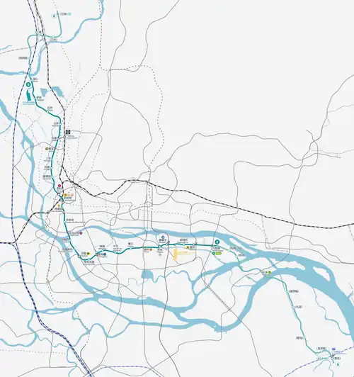 Line 8 of the Guangzhou Metro is a north-west L-shaped line on the system that runs from Jiaoxin to Wanshengwei, spanning a total of 33.9 km (21.06 mi)[4][5] with 28 stations. It interchanges with Line 1 at Chen Clan Academy, Line 2 at Changgang, Line 3 at Kecun, Line 4 at Wanshengwei, Line 6 at Cultural Park, and Line 18 at Modiesha. All stations on Line 8 are underground.[6] Line 8's color is teal.