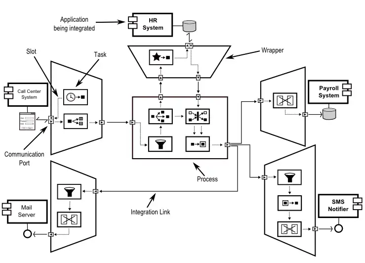 Processes: serve two purposes, namely: there are processes that allow to wrap applications and processes that allow to integrate them. The former are reusable processes that endow an application with a message-oriented API that simplifies interacting with it. Implementing such a wrapping process may range from using a JDBC driver to interact with a database to implementing a scrapper that emulates the behaviour of a person who interacts with a user interface. Generally speaking, this is known as wrapping an application in the literature. Integration processes, on the contrary, are intended to orchestrate the interactions with a number of wrapping processes and other integration processes. Processes rely on tasks to perform their wrapping or their orchestration activities. Simply put, a process can be viewed as a message processor.