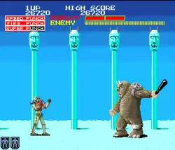 The player controls the robot with a four-way joystick and two attack buttons to punch and kick. The joystick is not only used for crouching, but for jumping as well. Punches and kicks are performed from either a standing, crouching or jumping position.[2] Along the way, there are three types of items that appear as flashing crosses: extra energy stock, invincibility and a long-range laser weapon.[1][2] On occasions, a red orb spawns on the ground and when picked up, increases the robot's punching power up to three times.[1][2]