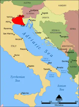 The Gulf of Venice[1] is an informally recognized gulf of the Adriatic Sea. It lies at the extreme north end of the Adriatic, limited on the southwest by the easternmost point of the Po Delta in Italy and on the southeast by the southernmost point of the Istrian Peninsula in Croatia. It is bordered by the coastlines of northeastern Italy and southwestern Croatia and Slovenia.