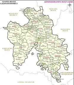 Gumma is a village and Community Development Block in the Gajapati District of Odisha state in India.[1] The Block had a population of 72,808 in 2020 census. Paralakhemundi (Odisha Vidhan Sabha constituency) (Sl. No.: 137) is its Vidhan Sabha constituency.This constituency includes Gumma block, Kashinagar block, Paralakhemundi block.