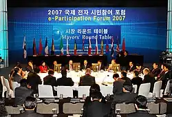 An "e-government" system based on this hosted the international e-participation forum[3] from February 7 to 9, 2007, with the participation of more than thirty-seven countries. The forum was launched with the theme "Promoting Democracy and Regional Development" and twenty-five mayors including André Santini (Issy-les-Moulineaux, France), Kevin Foy (Chapel Hill, US), Apirak Kosayothin (Bangkok, Thailand), Uvais Mohamed Emthiyas (Colombo, Sri Lanka), and world experts such as Dr William H. Dutton (Director of Oxford Internet Institute at the University of Oxford, UK) and Dr Ari-Veiko Anttiroiko (professor at the University of Tampere, Finland) participated in the forum. The Guro Declaration,[4] adopted during the forum, aims to set up a portal site for e-government development and to establish a concrete project in order to bridge the digital divide among the world's cities. This practice has been recognised for providing a new important step in the development of e-democracy.