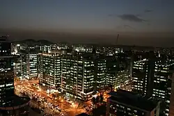 Textile manufacturing, dressmaking, and other labour-intensive industries declined after the 1990s and this affected regional development and became the cause of many problems.[5] Because of this, Guro District council has divided the district into four zones and has started developing each zone according to its characteristics in order to revitalise the economy of the area.[6] The four zones are: the Garibong Redevelopment Zone, Sindorim & Guro Stations area, the Gaebong Residential Area and the New Town Development on the Southwestern Outskirts.[7] After the reorganisation of the industrial structure in the late 1990s, more than 80% of I.T. companies settled in the area, creating the Guro Digital Industrial Complex. Meanwhile, many apartments were built replacing the old textile manufacturing factories to become a new, attractive residential area for south-west Seoul. The Development of Guro District's Four Zones is intended to be the centre for environmentally friendly residences, cutting-edge digital industry and logistics.