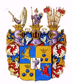By 1674 he had been elevated to the rank of count being given the name Gustaf Carlson, with Carlson as the house name of the comital family and with Börringe and Lindholmen as its counties. He was married to Baroness Isabella-Susanna von Schwartzenberg and their only child, a daughter, died before she had been baptized.[1][2]