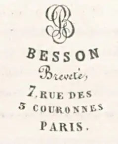 Besson's instruments were revolutionary in their design and quality, and as such became famous across Europe. After a series of lawsuits with Adolphe Sax, Besson left Paris in 1858 and relocated to London.[1] He continued to manufacture instruments in Paris and London and had distribution warehouses in Brussels, Charleroi, Madrid and Barcelona. After Besson's death in 1874, the company changed its name in France to become Fontaine-Besson in 1880.[2] It remained Besson in Great Britain.