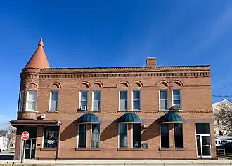 The Guttenberg State Bank, also known as the People's Bank, is a historic building located in Guttenberg, Iowa, United States. The bank was incorporated in May 1900 with John P. Eckart was its president. The bank was also referred to as "Eckart Bank".[2] They built this building two years later. It is a two-story brick structure that features a round tower with a conical roof on the corner. The second floor windows are topped with inlaid brick arches that combines with a brick stringcourse. Above is a brick cornice.