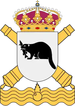 The coat of arms of the Härnösand Coastal Artillery Regiment (KA 5) was used by KA 5 from 1975 to 1994, by the Norrland kustartilleriförsvar med Härnösands kustartilleriregemente (NK/KA 5) from 1975 to 1994, by the Härnösands maringrupp med Härnösands kustartilleriregemente (HMG) from 1994 to 1997 and by the Härnösandsgruppen since 1997.[7] Blazon: "Argent, the town badge of Härnösand, a beaver, a pike in the mouth, both sable. The shield surmounted two gunbarrels of older pattern in saltire above a flaming grenade and waves".[7]