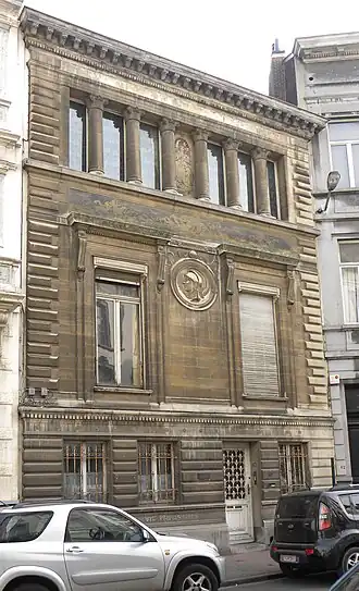 The building, with a strong Renaissance influence, was built in 1882[1] and is decorated with four sgraffiti.[2] It was the first time these were applied on a large scale in Brussels. They were drawn by sculptor Julien Dillens and executed by architect Jean Baes. Under the entablature of the two large windows, each has a narrow acanthus motif. Above it, a water-themed frieze depicts Triton and a siren surrounded by dolphins and putti. Between the columns is an allegory of architecture (plumb in hand and foot resting on a piece of Ionic column). The medallion between the windows is by Dillens and represents Minerva.[3] The Greek text τεχνων εραστρια means 'she who loves art'.[4] Under the cornice is a Venetian loggia. Between the columns are six blue tinted stained glass windows with geometric motifs.[4]