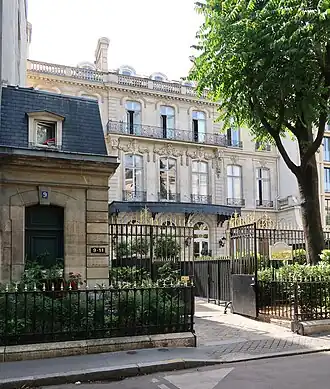 The Hôtel Le Marois, also known as the Hôtel de Ganay, was built in 1863 for Count Le Marois (1802-1870), son of General Le Marois, aide-de-camp to Napoleon I, on the site, it is said, of 'a house inhabited by the courtesan Marie Duplessis (1824-1847), model of The Lady of the Camellias by Alexandre Dumas fils.[2] Deputy of La Manche under the July Monarchy, senator in 1852, Count Le Marois was at the head of a great fortune and collected old and modern paintings. He left his old hotel on rue Blanche to move to the Champs-Élysées district. He had the hotel on the avenue d'Antin built by the architect Henri Parent.