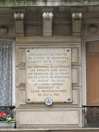 By the end of the 16th century, the Confrérie's audience for farces and secular drama had declined, and they began to rent the theatre to itinerant, French and foreign theatrical troupes.[8] The Italian troupe I Gelosi is known to have performed in the theatre.[9] Agnan Sarat appeared there as early as 1578, and the English company of Jean Thays is believed to have been at the Bourgogne twenty years later.[3]