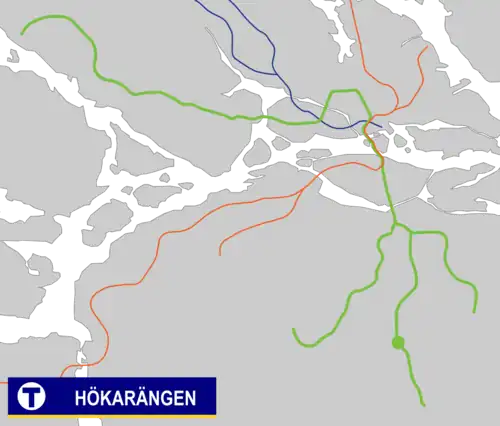 Hökarängen metro station is on the green line of Sweden's Stockholm metro, located in Hökarängen, Söderort. The station was inaugurated on 1 October 1950 as part of the inaugural stretch of Stockholm metro between Slussen and Hökarängen. On 18 November 1958 the line was extended south to Farsta.[2] The distance to Slussen is 7.7 km (4.8 mi).