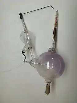 X-rays are generated when high energy electrons are stopped by a hard target. In the earliest tubes, the electrons were generated by the collision of positive ions with the cathode. To produce the ions, a low pressure gas had to be maintained inside the tube. Unfortunately, as this type of tube is used, the low pressure gas is gradually depleted causing the tube current and therefore the x-ray output to fall. The operator could compensate for this by increasing the voltage on the tube, but this would produce "harder" or more penetrating x-rays. In many cases this degraded the image quality. One early solution was to introduce a small amount of gas back into the tube. Unfortunately this procedure was difficult to control and it only provided a temporary solution. Saÿen's design solved this problem by a clever strategy that ensured a constant gas pressure in the tube. As the gas in the main part of the Saÿen tube (see photo) is depleted, the electrical resistance in the tube would increase causing the current to take a lower resistance path: a spark through the air gap to the wire leading to the smaller bulb. That current would heat the material in the small bulb and cause it to release gas back into the main tube. Once the gas pressure rose in the main tube, its electrical resistance would drop back into normal operating range. The gas pressure in the tube could be adjusted by controlling the size of the air gap: a larger gap meant that the tube would operate at a higher voltage with harder (higher energy, more penetrating) x-rays. Saÿen used potash (potassium hydroxide, KOH) in the side bulb but other chemicals that would outgas when heated were also used.[6] James W. Queen & Company manufactured and sold the "Queen Self Regulating X-Ray Tube" for several years.