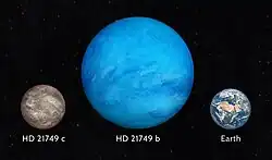 The inner planet, HD 21749 c (the second in order of discovery), is orbiting the star at a distance of 0.08 AU with a period of just 7.8 days. A terrestrial planet, it has a radius of 1.1 R🜨 and was the first Earth-sized planet found by TESS.[6][5] Its mass is too low to be calculated with current radial velocity data, with an upper limit of 3.5 M🜨; a probabilistic model estimates it is most likely between 1 and M🜨.[6]