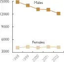 A chart of AIDS deaths in the United States from 1998 to 2002