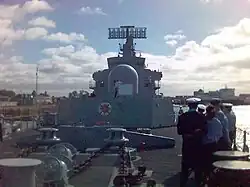 Bristol was refitted at A&P Tyne, Hebburn. The effects of the refit were said to "... extend the service life of HMS Bristol for 10 years". Work was intended to bring facilities on Bristol in line with health and safety standards.[7] The redundant masts containing the ship's Type 1022 and Type 992Q search radars were removed.[8] She departed from Portsmouth on 20 October 2010,[9] and arrived at Hebburn under tow on the morning of 3 November 2010. HMS Bristol left Hebburn in April 2011[10] to return to Portsmouth.[11]