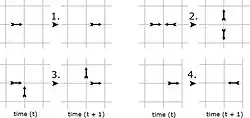 • Each lattice grid cell can only contain a maximum of one particle for each direction, i.e., contain a total of between zero and four particles.