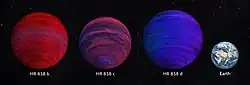 In May 2019, HR 858 was announced to have at least 3 exoplanets as observed by the transit method with the Transiting Exoplanet Survey Satellite. All three are orbiting close to the host star and are close in size, each about twice the radius of the Earth. Described as super-Earths by their discovery paper,[4] measurements of their masses suggest that in terms of composition they may be better described as sub-Neptunes.[6] Planets 'b' and 'c' may be in a 3:5 mean-motion resonance.[4]
