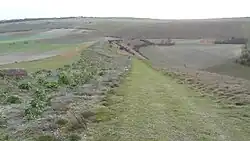 Hackpen Hill Bowl Barrow is a Bronze Age barrow a few metres north of Hackpen Down. It is approximately 21 metres in diameter and 1.4 metres high, surrounded by a quarry ditch from which material was taken to construct it, but which is now largely infilled. There is a depression at the top probably caused by an excavation by antiquarians, although no record of this survives. It is a Scheduled monument, and its grid reference is SU 3510 8518.[5]