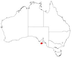 This species is endemic to a small area on the western end of Kangaroo Island in South Australia. It is confined to the more elevated parts of the lateritic plateau system, up to 100 metres above sea level and is part of the dense mallee-heath that grows in clay-loam to sandy soils.[1][4]
