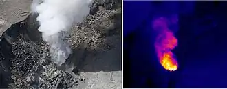Crater activity began to increase when between March 10 and March 14, 2008, gas began to vent from the east wall fumarole directly below the Crater Overlook.[13] At 02:58 am HST on March 19, 2008, HVO personnel recorded seismic events, and sunrise revealed a 20–30 meter (65–100-foot) diameter hole blown in the side where the vent once was; the explosion scattered debris and spatter across 0.30 square kilometers (74 acres) and damaged the Crater Overlook.[14] Pieces as large as 20 millimeters (1 in) were found on Crater Rim Drive while 0.3 m (1 ft) blocks hit the crater overlook area.[15] This was the first explosive eruption of Halemaʻumaʻu since 1924, and the first lava eruption from the crater since 1982.[16] The new crater formed in the explosion was informally named "Overlook Crater" by Hawaiian Volcano Observatory staff.[12]