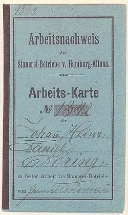 - ^ a b c Schupp, Johannes Martin (1908). Die sozialen Verhältnisse im Hamburger Hafen [Social conditions in the Port of Hamburg] (in German). Kiel. Archived from the original on 2009-12-09.