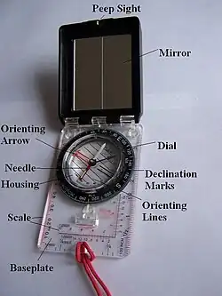 - ^ Johnson, Mark, The Ultimate Desert Handbook: A Manual for Desert Hikers, Campers, and Travelers, McGraw-Hill Professional (2003), ISBN 0-07-139303-X, 9780071393034, p. 134: A direct-sighting compass uses a magnifying viewfinder mounted in the compass body to directly view a degreed dial and superimposed indicator line; it therefore differs from a lensatic sight (which uses a simple magnifying lens on a folding arm positioned over the dial), or a prismatic sight (which uses a magnifying optical prism).