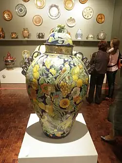 Mayolica wares have won national competitions and are sold throughout Mexico and abroad. One notable artisan is Gorky Gonzalez, winner of Mexico National Prize for Arts and Sciences.[6] Gonzalez reproduces colonial era pieces, from pieces that survive from the era as well as original pieces based on the old designs. One common motif is the eagle from the Mexican seal, portrayed with wings spread.[2]