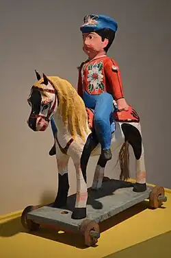 Toys, especially miniatures, are carved from wood, which includes dollhouse furniture, jointed animal figures and human figures such as boxers.[2] Juventino Rosas and Silao are particularly noted for this work and one notable craftsman was Gumersindo España Olivares, whose work was commented upon by chronicler Juventino Rosas.[1]