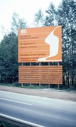 The first preliminary drafts of a new line for the development program for the Deutsche Bundesbahn network were developed between 1968 and 1970.[21] On 4 August 1969, the head office of Deutsche Bundesbahn issued a first planning order for a new line that would run from Nordstemmen (south of Hanover) via Fulda to Würzburg.[22] With the approval of the DB network development program in 1970, the executive board (Vorstand) and board of directors of the then national railway made it possible to commission planning for new and upgraded lines. The line between Hanover and Gemünden am Main was one of the most urgent projects.[23] In 1971, a contract for the planning of the line was issued.[24]