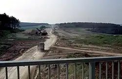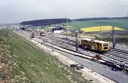 After completion of the regional planning procedure, the planning approval procedure began. The route was divided into 88 planning approval sections.[23] For this purpose, preliminary draft plans on a scale of 1:5000 were first drawn up, which were finally specified for the approval planning on a scale of 1:1000.[24] In May 1981, 75 of the 314 kilometres of route between Rethen and Würzburg were approved,[50] in late summer 1982 113 kilometres.[21] Particular difficulties arose from the construction of new railway power lines. In order to limit the effects of the new line on many farms that had to be crossed, countless land consolidations were necessary.[23] In the absence of applicable federal law, noise protection along the route was based on agreements with the federal states concerned.[51]