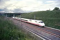 As a rule, the largest permitted curve radius is 7000 metres, the minimum radius permitted in special cases is 5100 metres.[63] These values resulted from the initially planned design speed (250 km/h) and the initially planned minimum speed of freight trains (80 km/h).[64] The standard superelevation is 65 millimetres, the maximum superelevation—to limit excessive wear[65]—90 millimetres (according to other sources 80 millimetres[63]). The maximum cant deficiency is 60 millimetres.[66] The maximum gradient of 1.25 percent resulted from the requirement to be able to start up again after a stop on such gradients, even with heavy freight trains.[65] As late as the mid-1970s, plans were still in place to initially only allow speeds of up to 200 km/h on the route in a first stage of development and to leave open a later upgrade for up to 300 km/h.[67] The design speed ultimately adopted was 300 km/h with a cant deficiency of 130 millimetres at 250 km/h. The maximum speed of the ICEs was initially limited to 250 km/h.[63]