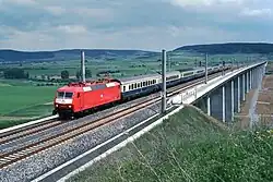 On 28 May 1984, the board of directors of Deutsche Bundesbahn approved the high-speed railway project, which envisaged using the line for high-speed traffic at speeds of up to 250 km/h as soon as it went into operation.[36] The necessary changes to the route planning were minor, mainly because the Re 250 overhead line had already been tested and was intended for installation.[41]